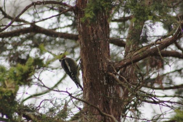 This next bird only paid a quick visit to the Bird Watching Garden and remained mostly out of sight. Pictured here is a yellow-bellied sapsucker, a species of woodpecker that breeds further north but can be seen in our area during migration or sometimes through the winter. Evidence of sapsucker activity can be seen on trees all year. Sapsuckers drill a row of holes in a tree and wait for the sap to leak out, attracting insects. It will then eat both the sap and the insects it has trapped.