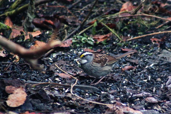 Several weeks ago, a tan-striped white-throated sparrow was featured. Pictured here is the other color form, the white-striped variation. They are boldly colored and unmistakable. Either color variety can be male or female but something interesting that has been discovered is that each color variety generally prefers the opposite color variety to themselves. There is also a difference in behavior between color forms; the white-striped color form is overall more aggressive and territorial.