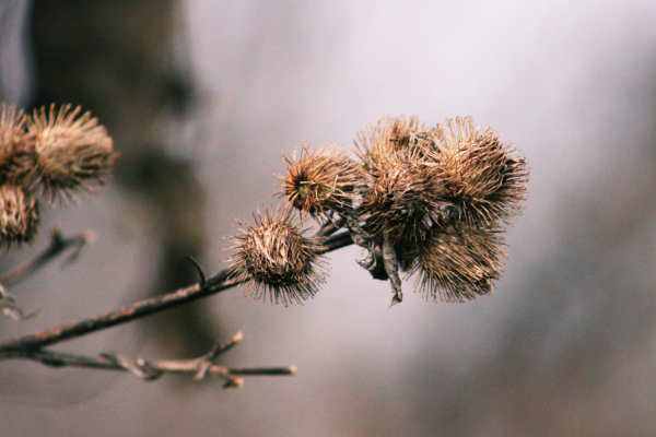 Burdock has a different method of seed dispersal. Burdock produces burs that contain their seeds. Look closely and you will notice tiny hooks at the tips of the little hairs on the seed heads. These hooks easily grab onto fur or clothing. Burdock has such an effective mechanism that it is what inspired the invention of Velcro.