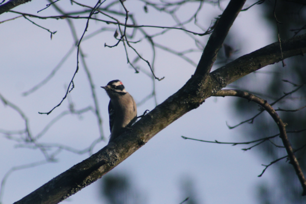 Downy woodpeckers are the most commonly seen woodpecker in the Bird Watching Garden. Pictured here is a male, indicated by the patch of red feathers on the back of his head. Downy woodpeckers are the smallest woodpeckers in North America. They also have a relatively small beak for a woodpecker, a helpful feature for distinguishing them from the similar hairy woodpecker.