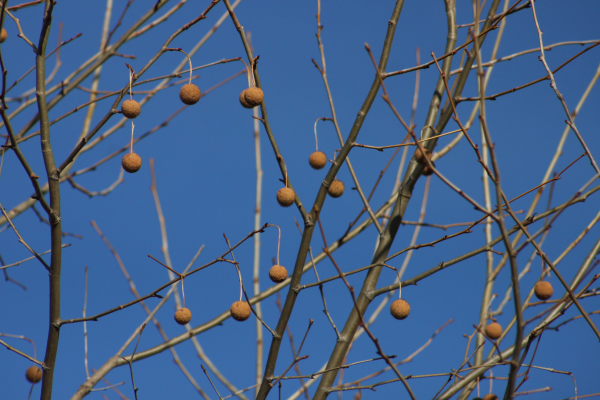 Sycamores have great features that stand out in the winter like persisting stipules on the twigs and beautiful peeling bark. Another recognizable feature are their seed-filled balls hanging from the twigs. These seeds remain condensed in a ball until late winter or early spring when they are dispersed by the wind.