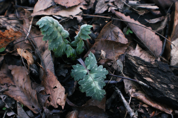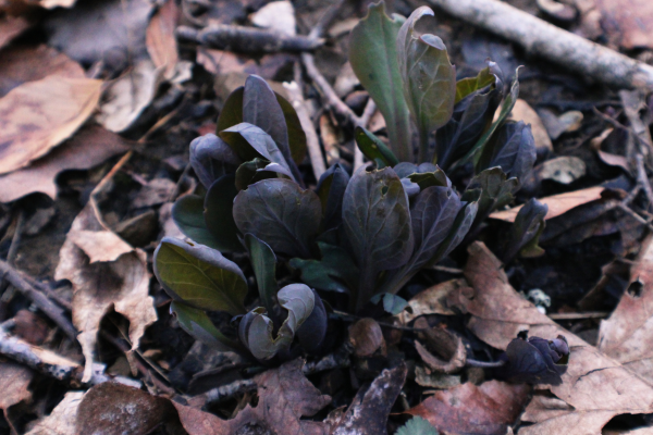 Virginia bluebells are beautiful in bloom, but this early on the leaves can be hard to spot amongst the leaf litter. They begin as a deeper purple color due to high amounts of anthocyanin pigment but as the plant matures the anthocyanin breaks down and the leaves become a soft green.
