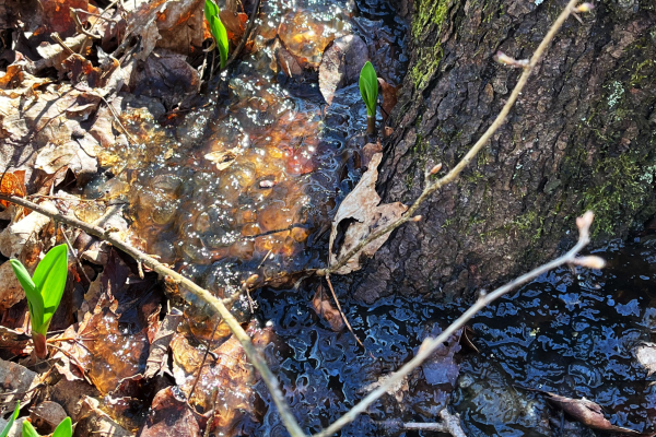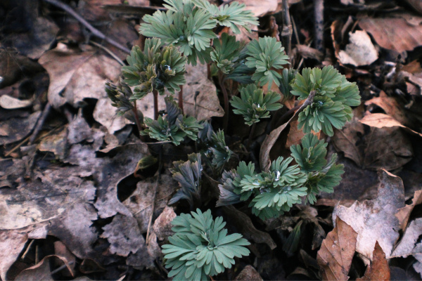 Now we zoom in on some exciting developments on the forest floor in the Woodland Garden. Plenty of spring ephemeral wildflowers have begun to appear, although for now it is mostly just the leaves. Pictured here are the feathery leaves of dutchman’s breeches, beautiful on their own but they will soon be accompanied by small white flowers in the shape of upside-down pants.