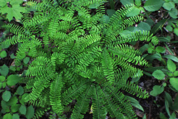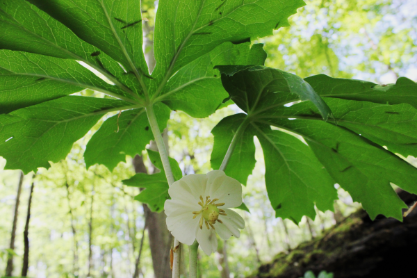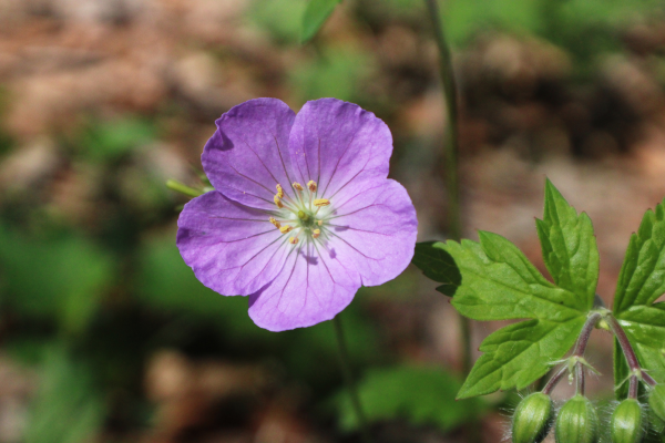 Wild geranium is a common spring ephemeral wildflower that can be seen now in the Woodland Garden. They have fairly large flowers of an inch to an inch and a half in diameter and their pinkish purple color makes them almost glow in the dappled light of the forest floor.