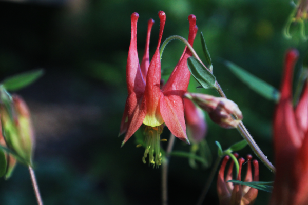 Another wonderful wildflower currently blooming in both the Bird Watching Garden and the Woodland Garden is eastern red columbine. There are several species of columbine, all with the incredible flower structure seen in the eastern red columbine, but this is the only species native to the eastern United States. It tends to bloom perfectly in time with the return of the migrating ruby-throated hummingbirds who can reach the nectar located deep in the flower’s spurs.
