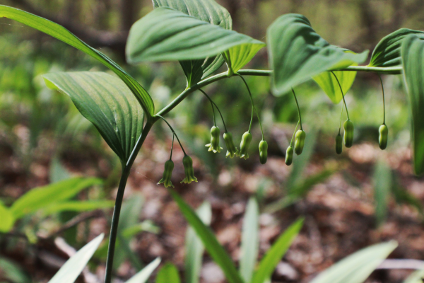 Unlike the previous wildflower, Solomon’s seal flowers may be easily overlooked. Not only are the flowers a shade of green, but they also hang below the leaves of the plant. The young shoots of this plant are edible and can be prepared similar to asparagus. Eventually, the flowers develop into dark blue berries beneath the leaves. A beautiful variegated Solomon’s seal can be seen in the Bird Watching Garden.